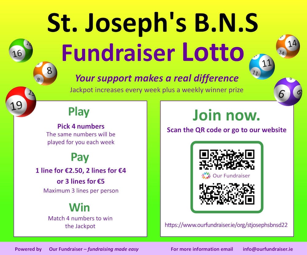 At St. Joseph’s BNS, we are committed to providing the very best equipment, teaching, and learning resources for our pupils. However, like many schools in Ireland, the costs of delivering the highest standards go beyond the grants provided by the Department of Education. To help bridge this gap, we have launched our School Fundraiser Lotto.